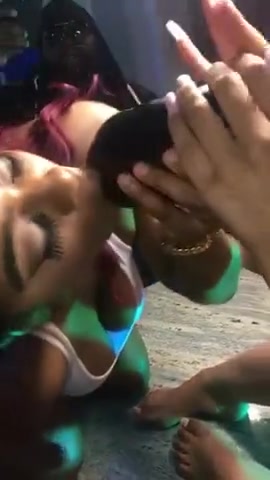 Adorable young black chick with purple hair gives a long and sloppy dildo blowjob
