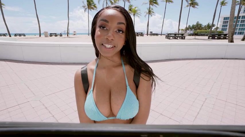 A beautiful ebony with big tits asks the driver to give her a ride. In return, she is ready to pay with a good sex. Besides, the cutie has no equal in this matter! She undresses in the back seat of the bus, teases the guy with her huge breasts and gives him a great titfuck! Also this doll plays with a dick professionally and agrees to take it into her sweet tight pussy. A wild sex with this beauty will be an unforgettable adventure for a guy!