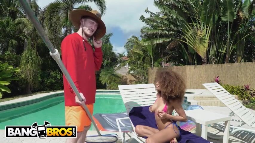Sweet ebony babe Cecilia Lion seduces the pool guy Brick Danger