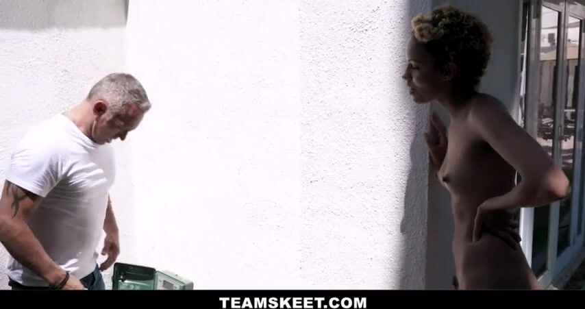 An attractive ebony girl with short hair is going to serve an old man. She undresses in front of him, teases him with her slender body and spreads her long legs in front of him. This cutie lets the old man touch her wet pussy with his finger, and then she takes a huge dick there and enjoys passionate sex in a missionary position. This chocolate lady has a very hot temperament, so she can drive her partner crazy!